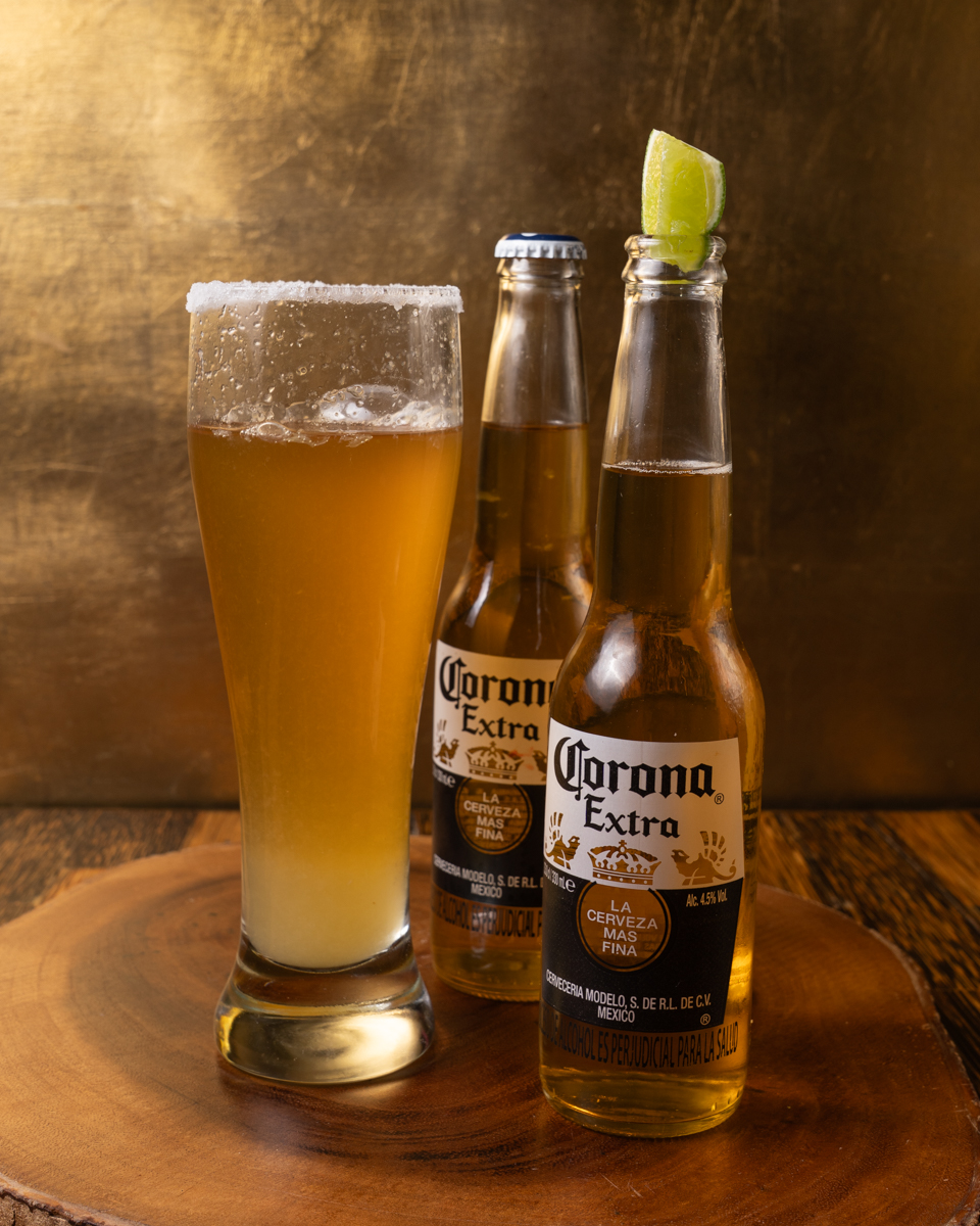 Michelada: vaso con limón y sal.